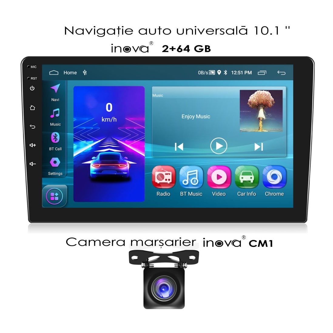 Navigatie auto universala INOVA® 10.1 inch, 2DIN, 2GB RAM, 64GB ROM, Camera marsarier CVBS & AHD, Android Auto Cablu, Carplay Wireless, GPS, Bluetooth 4.0, Radio FM, Touchscreen, 2 x USB, Control comenzi volan