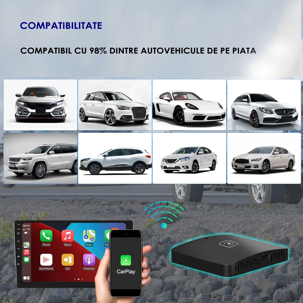 Adaptorul este compatibil cu majoritatea modelelor de mașini care acceptă CarPlay cablat, oferind posibilitatea de a folosi CarPlay wireless chiar și în vehicule care nu dispun de această funcție din fabrică.