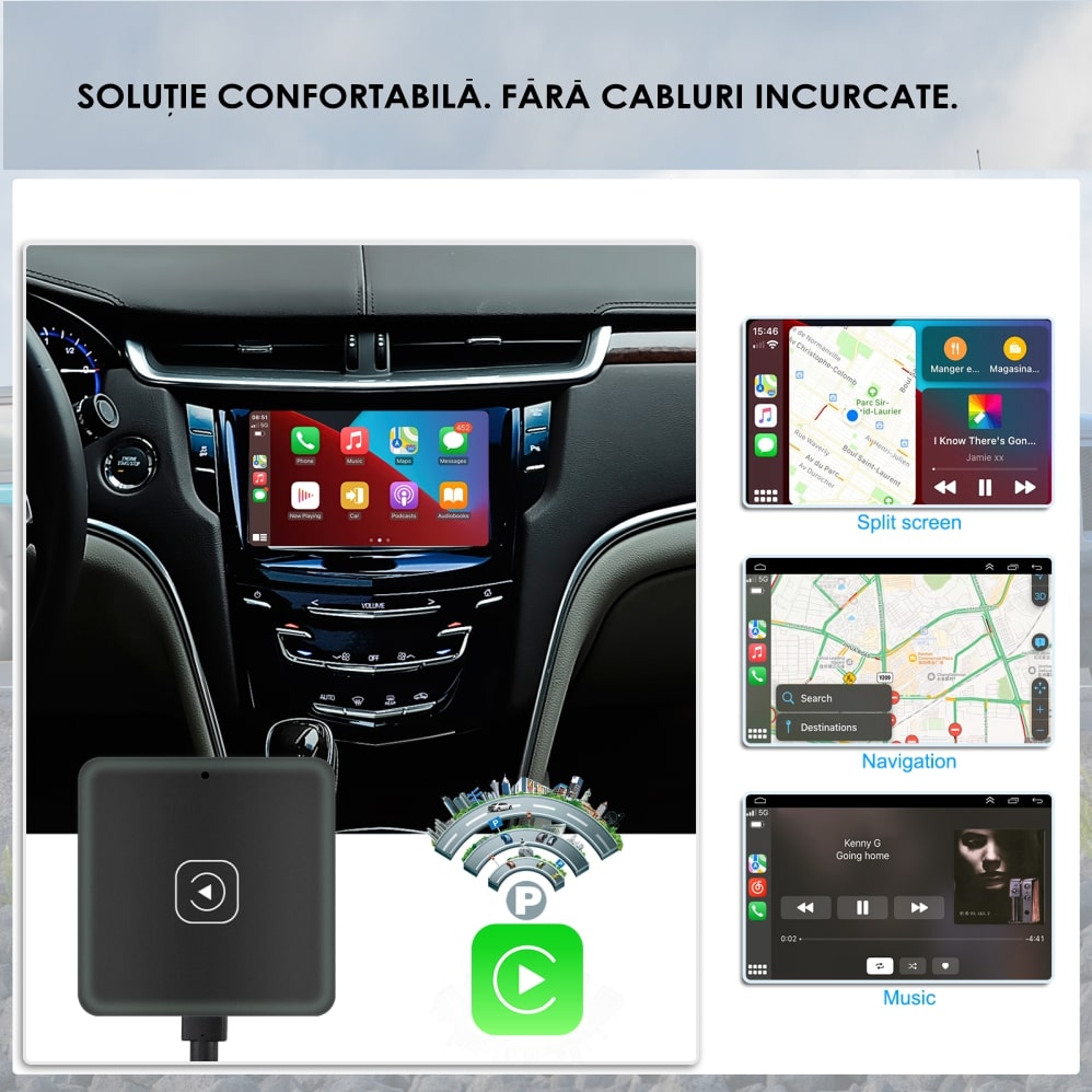 Adaptorul CarPlay wireless este conceput pentru a funcționa doar pe vehicule care acceptă deja CarPlay cu fir. Așadar, dacă mașina ta are deja CarPlay activat prin cablu, adaptorul va prelua acea conexiune și o va face wireless. Dacă mașina ta nu este compatibilă cu CarPlay prin cablu, adaptorul nu va putea să activeze funcționalitatea wireless!