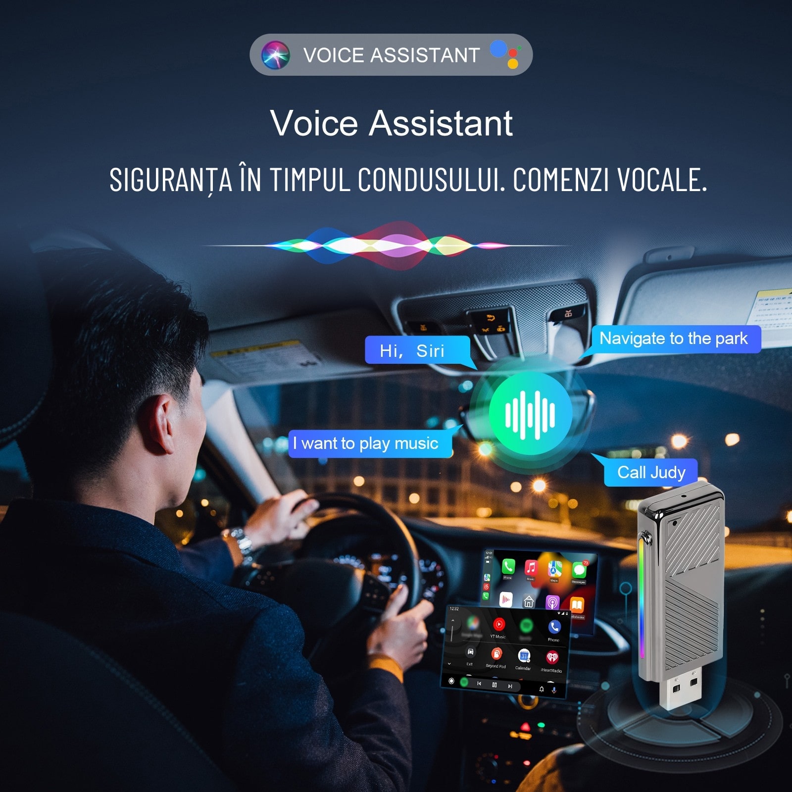 Siguranța în timpul condusului. Comenzi vocale: Atât Siri, cât și Google Assistant pot fi folosite pentru a efectua apeluri, trimite mesaje sau a solicita informații, oferindu-ți o experiență de conducere mai fluidă și mai sigură.