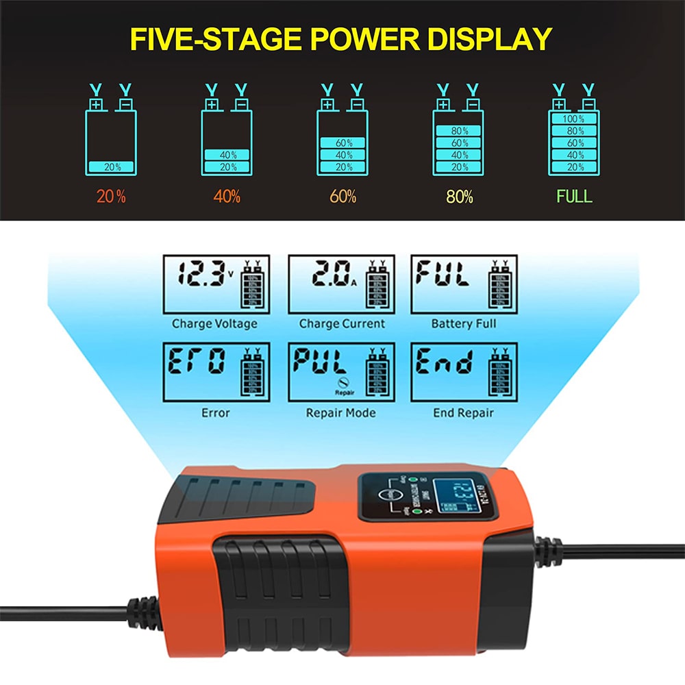 Compatibilitate versatilă: Potrivit pentru majoritatea tipurilor de baterii cu plumb-acid, inclusiv baterii Calcium, Gel, Wet și Lead Acid.