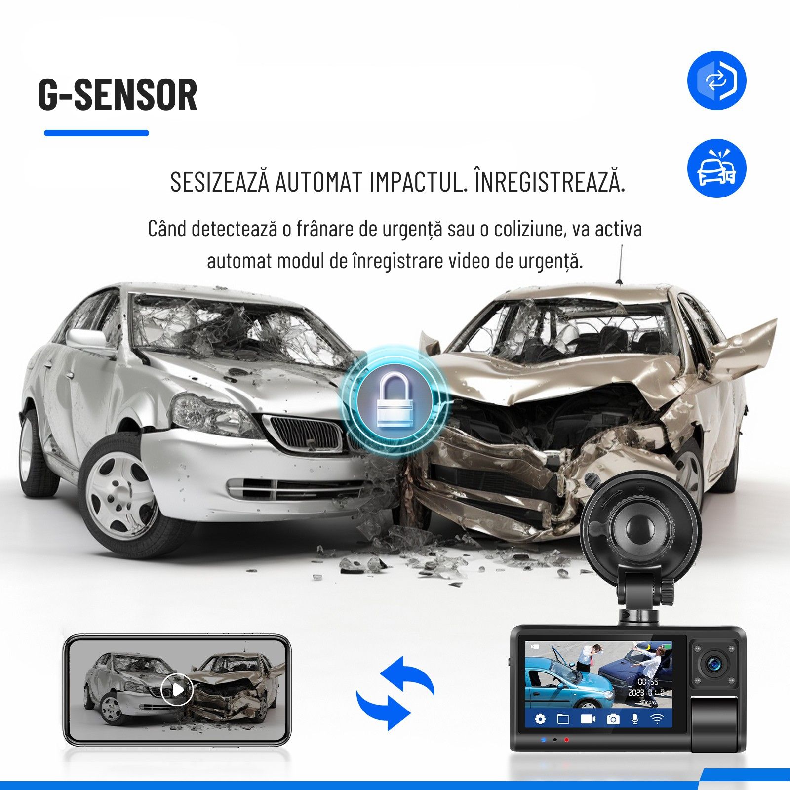 Înregistrare ciclică: Suprascrie automat cele mai vechi fișiere atunci când memoria este plină, excepție făcând fișierele protejate (video-uri blocate).