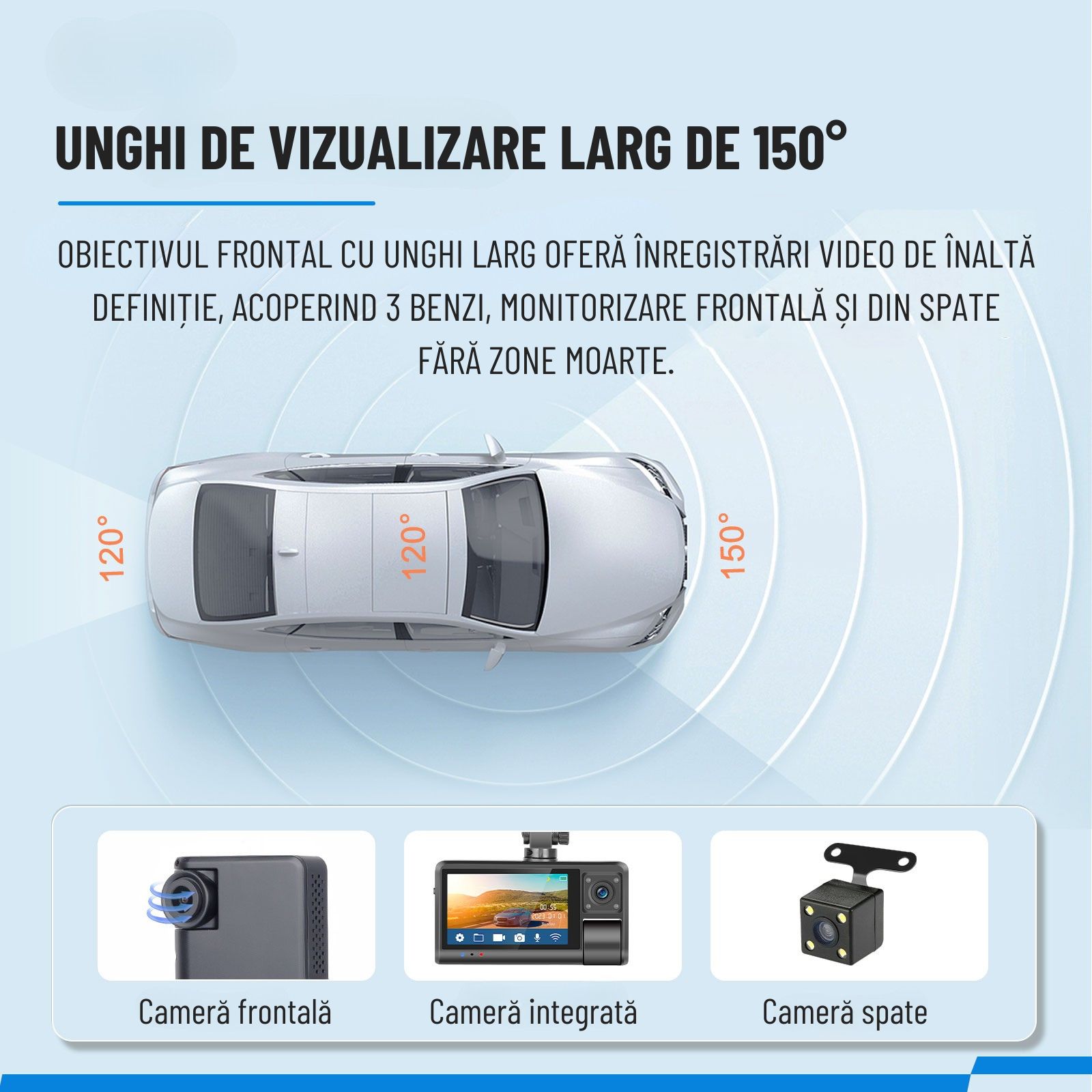 Unghi de vizualizare: 150°, pentru capturarea unei arii extinse, inclusiv trei benzi de trafic.
