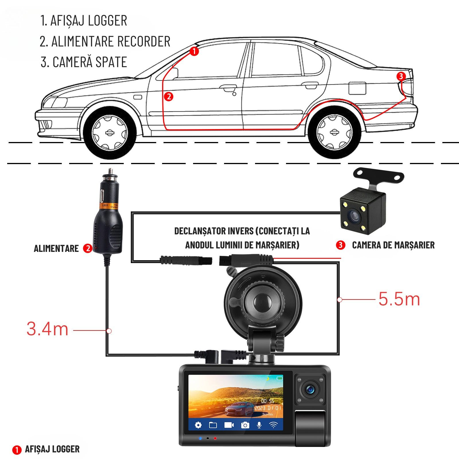 Camera auto DVR triplă este un dispozitiv performant, proiectat pentru a îmbunătăți siguranța și confortul în timpul condusului. Aceasta oferă o gamă largă de funcționalități, un unghi de vizualizare extins de 150°, rezoluție Full HD 1080P, și posibilitatea de înregistrare continuă. Camera este dotată cu un ecran de 3 inch pentru redare clară a imaginilor și un senzor de imagine de înaltă calitate.